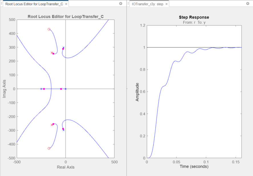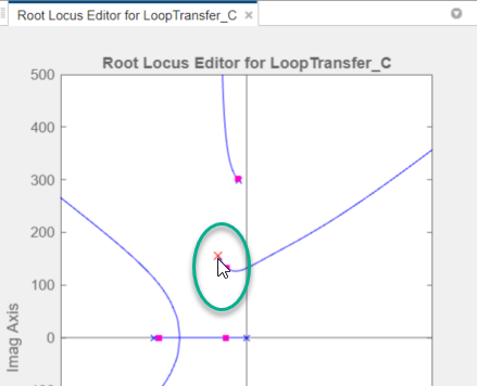 In the Root Locus Editor, drag the new poles to locations near –140 ± 260i. As you drag one pole, the other pole updates automatically.