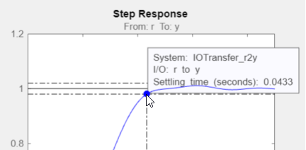 To verify the exact settling time, right-click the Step Response plot area and select Characteristics > Settling Time. A settling time indicator appears on the response plot.