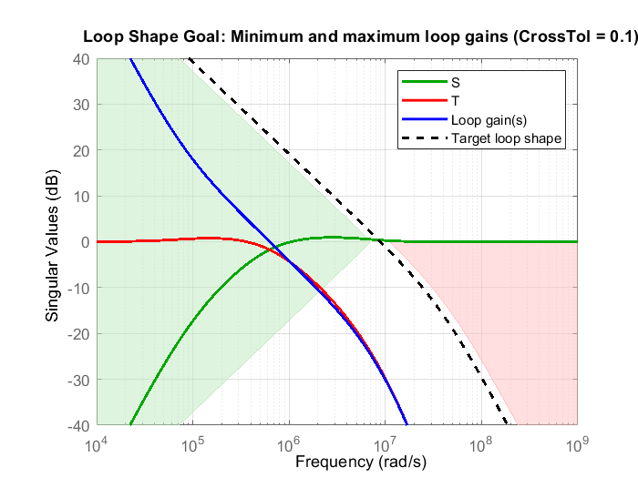 LoopGain = frd([100,10,1,1e-2,1e-4],2*pi*[1e4,1e5,3e6,3e7,3e8]); % frd uses response data and corresponding frequencies in rad/s LoopShapeGoal = TuningGoal.LoopShape('X',LoopGain); % Use AnalysisPoint as location where open-loop response shape is measured LoopShapeGoal.Focus = 2*pi*[1e3, 1e9]; % Enforce goal in frequency range (use rad/s) LoopShapeGoal.Name = 'Loop Shape Goal'; % Tuning goal name MarginsGoal = TuningGoal.Margins('X',7.6,60); MarginsGoal.Focus = [0 Inf]; MarginsGoal.Openings = {'X'}; MarginsGoal.Name = 'Margins Goal';