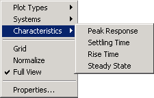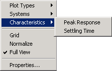 The Characteristics menu changes for each plot response type. Characteristics refers to response plot information, such as peak response, or, in some cases, rise time, and settling time.