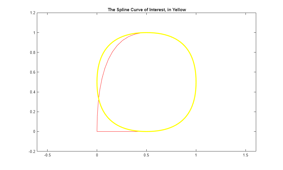 mycv = fnbrk(curve,[3 7]); fnplt(mycv,'y',2.5); title('The Spline Curve of Interest, in Yellow')
