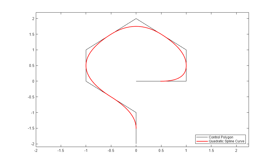 points = [0 0; 1 0; 1 1; 0 2; -1 1; -1 0; 0 -1; 0 -2].'; values = spcrv(points,3); plot(points(1,:),points(2,:),'k'); axis([-2 2.25 -2.1 2.2]); hold on plot(values(1,:),values(2,:),'r','LineWidth',1.5); legend({'Control Polygon' 'Quadratic Spline Curve'}, 'location','SE');