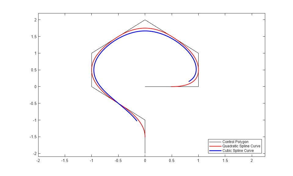 value4 = spcrv(points,4); plot(value4(1,:),value4(2,:),'b','LineWidth',2); legend({'Control Polygon' 'Quadratic Spline Curve' ... 'Cubic Spline Curve'}, 'location','SE');