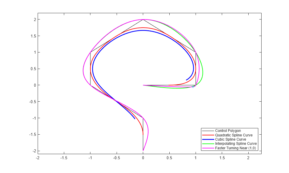 fnplt(cscvn(points), 'g',1.5); legend({'Control Polygon' 'Quadratic Spline Curve' ... 'Cubic Spline Curve' 'Interpolating Spline Curve'}, ... 'location','SE');