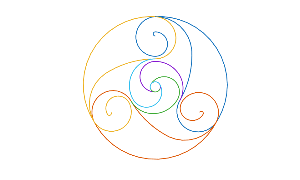 It is easy to generate striking patterns with this tool using just a few data points. For example, here is a version of the design on the Bronze Triskele Medallion in the Ulster Museum in Belfast, supposedly done by pieces of circular arcs a long time ago.