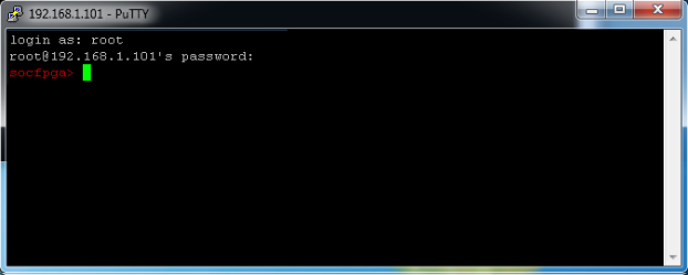 5. When a terminal window opens, log in as the user root with password cyclonevsoc. The terminal window displays a Linux terminal.