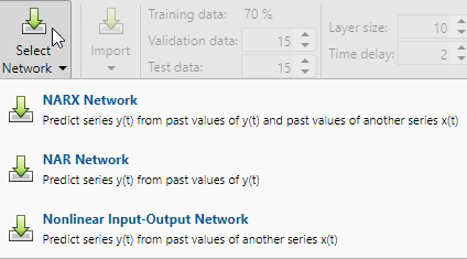 For this example, use a NARX network. Click Select Network > NARX Network.