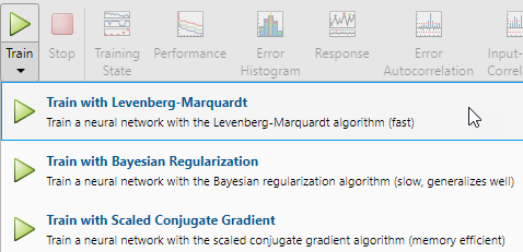 To train the network, select Train > Train with Levenberg-Marquardt. This is the default training algorithm and the same as clicking Train.