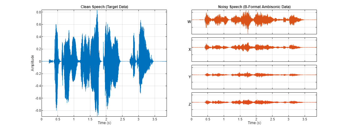 soundsc(ambisonicData(:,channel),fs)To plot the clean speech and the noisy ambisonic data, use the supporting function compareAudio.