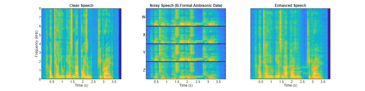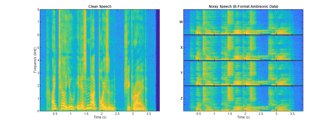 To visualize the spectrograms of the clean speech and the noisy ambisonic data, use the supporting function compareSpectrograms.