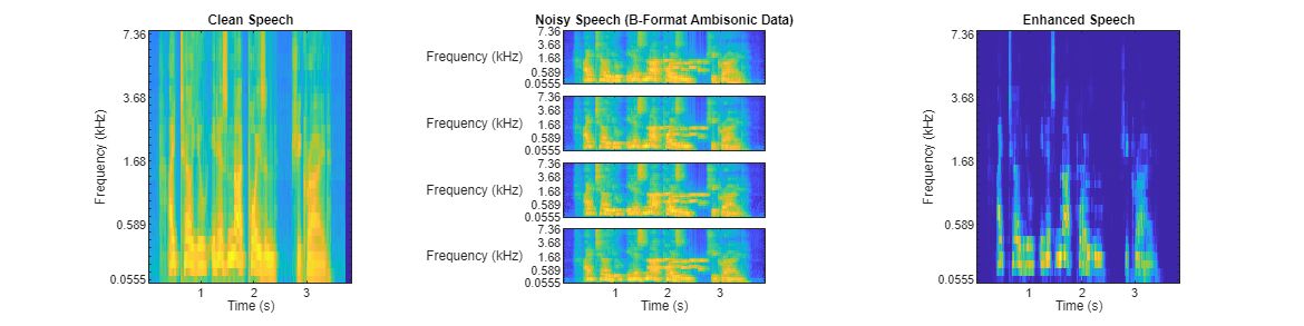 compareAudio(cleanSpeech,ambisonicData,enhancedSpeech)