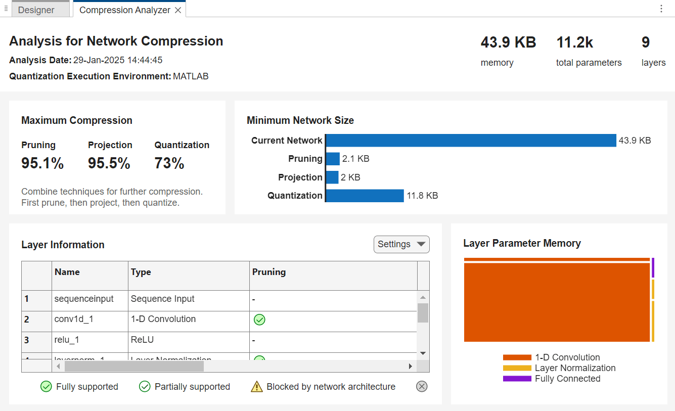 Get a report on how much compression pruning or projection of the network can achieve by clicking the Analyze for Compression button in the toolstrip.