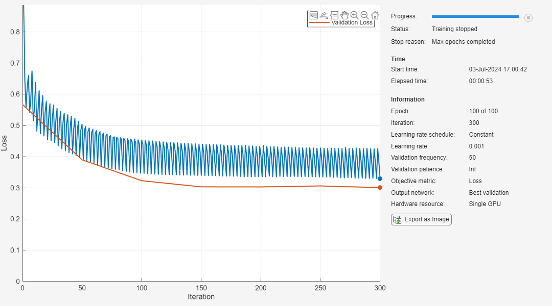 options = trainingOptions("adam", ... InputDataFormats="CTB", ... MaxEpochs=100, ... L2Regularization=0.1, ... ValidationData={XValidation, TValidation}, ... OutputNetwork="best-validation-loss", ... Plots="training-progress", ... Verbose=false); netPruned = trainnet(XTrain,TTrain,netPruned,"mse",options);