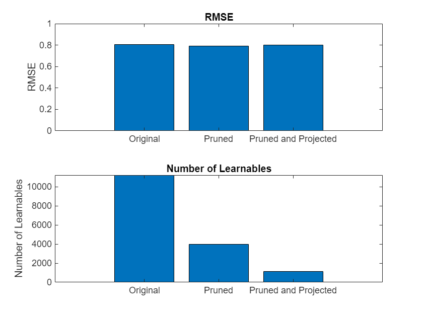 infoOriginalNetwork = analyzeNetwork(net,Plots="none"); infoPrunedNetwork = analyzeNetwork(netPruned,Plots="none"); infoProjectedNetwork = analyzeNetwork(netProjected,Plots="none"); numLearnablesOriginalNetwork = infoOriginalNetwork.TotalLearnables; numLearnablesPrunedNetwork = infoPrunedNetwork.TotalLearnables; numLearnablesProjectedNetwork = infoProjectedNetwork.TotalLearnables; figure tiledlayout("flow") nexttile bar([rmseOriginalNetwork rmsePrunedNetwork rmseProjectedNetwork]) xticklabels(["Original" "Pruned" "Pruned and Projected"]) title("RMSE") ylabel("RMSE") nexttile bar([numLearnablesOriginalNetwork numLearnablesPrunedNetwork numLearnablesProjectedNetwork]) xticklabels(["Original" "Pruned" "Pruned and Projected"]) ylabel("Number of Learnables") title("Number of Learnables")