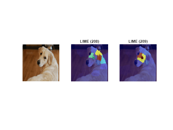 Use the imageLIME function to view the most important features in the classification decision of a deep network. Compute the LIME map for the top two classes: golden retriever and Labrador retriever.
