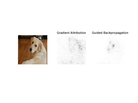 The maps show which areas of the image are important to the classification. Red areas of the map have a higher importance—an image lacking these areas would have a lower score for the specified class. For the golden retriever class, the network focuses on the dog's head and ear to make its prediction. For the Labrador retriever class, the network is more focused on the dog's nose and eyes, rather than the ear. While both maps highlight the dog's forehead, for the network, the dog's ear and neck indicate the golden retriever class, while the dog's eyes indicate the Labrador retriever class.