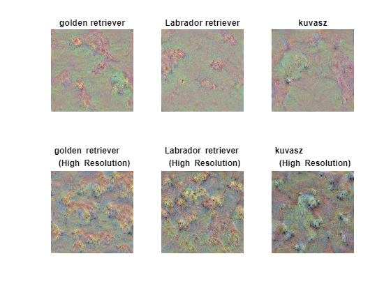 tiledlayout(2,3) for i = 1:3 nexttile imshow(dreamImage(:,:,:,i)); title(string(topClasses(i))); end for i = 1:3 nexttile imshow(dreamImageDetailed(:,:,:,i)); title(string(topClasses(i)) + "\newline (High Resolution)"); end