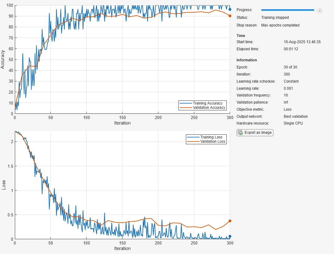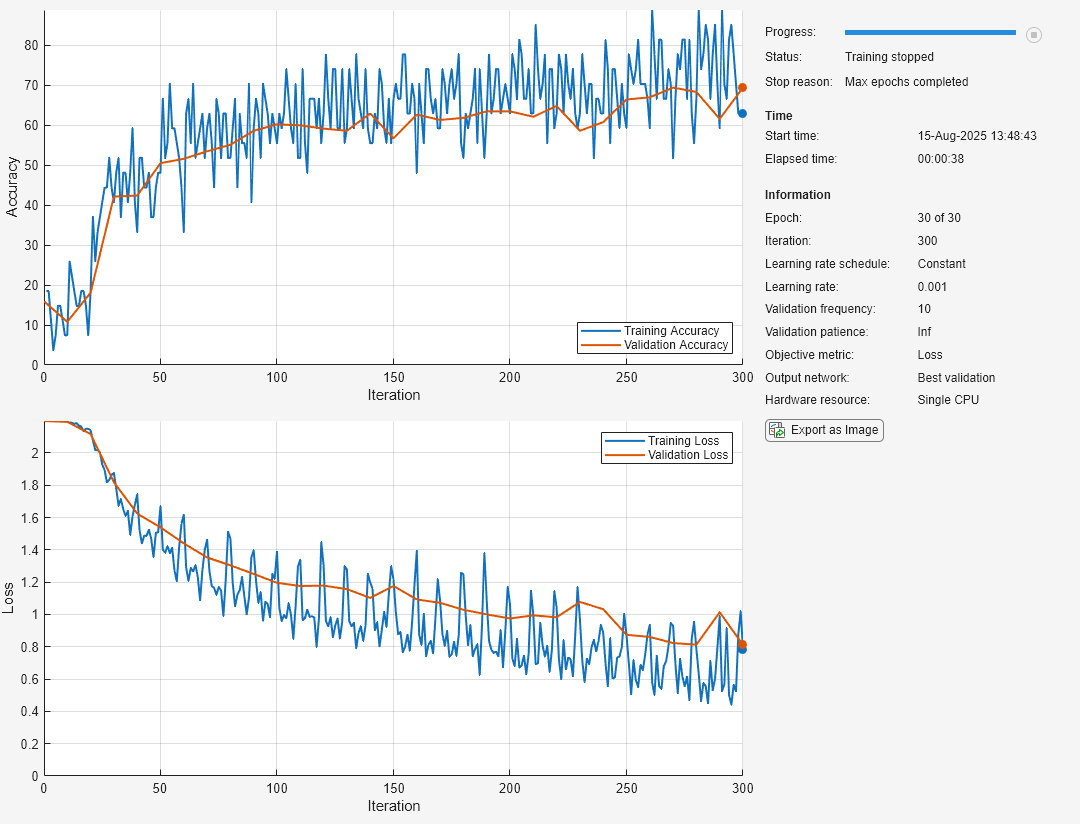 maxEpochs = 30; miniBatchSize = 27; numObservations = numel(XTrain); numIterationsPerEpoch = floor(numObservations / miniBatchSize); options = trainingOptions("adam", ... ExecutionEnvironment="cpu", ... MaxEpochs=maxEpochs, ... InputDataFormats="CTB", ... Metrics="accuracy", ... MiniBatchSize=miniBatchSize, ... GradientThreshold=2, ... ValidationData={XTest,TTest}, ... ValidationFrequency=numIterationsPerEpoch, ... Verbose=false, ... Plots="training-progress");