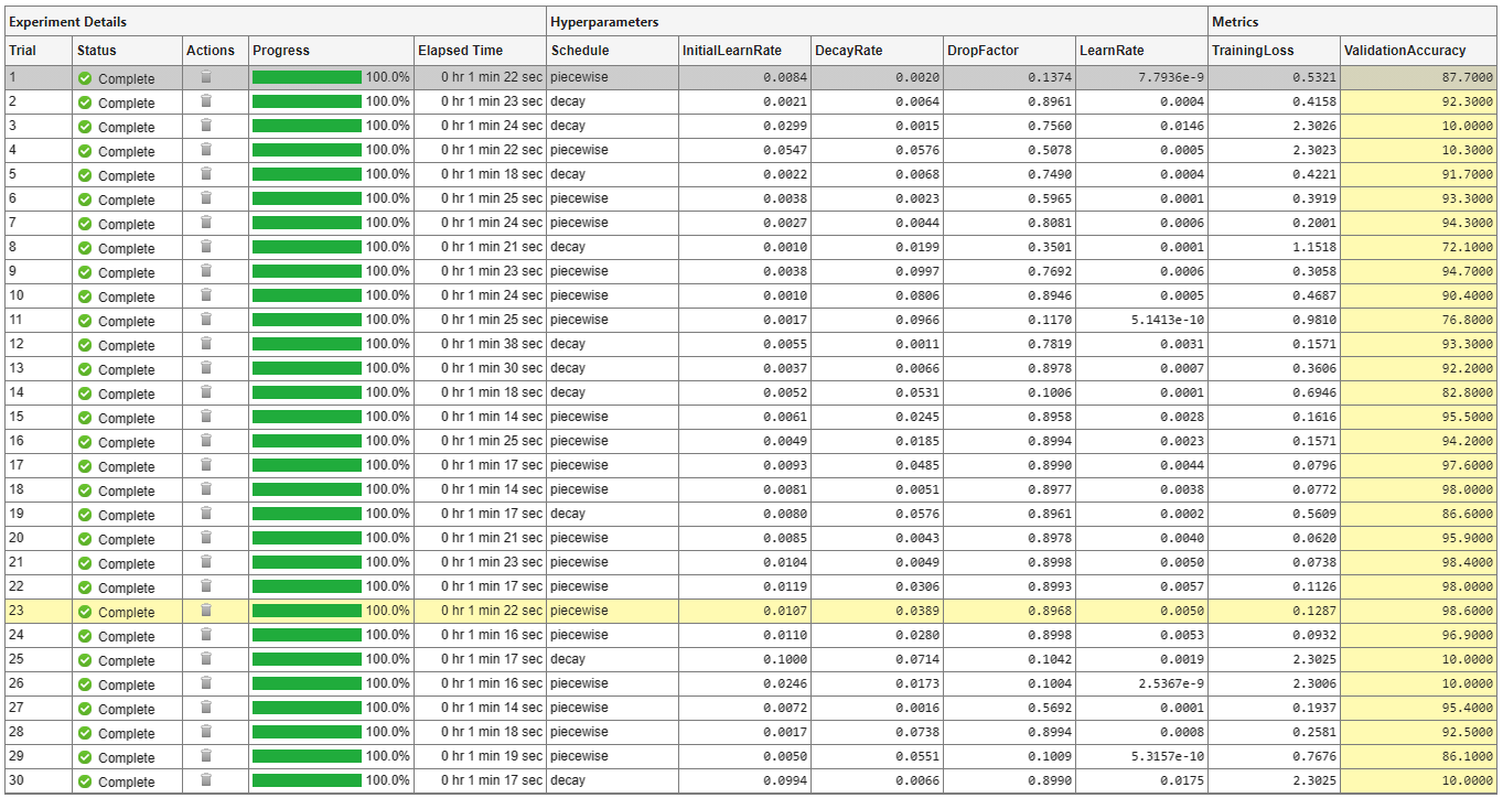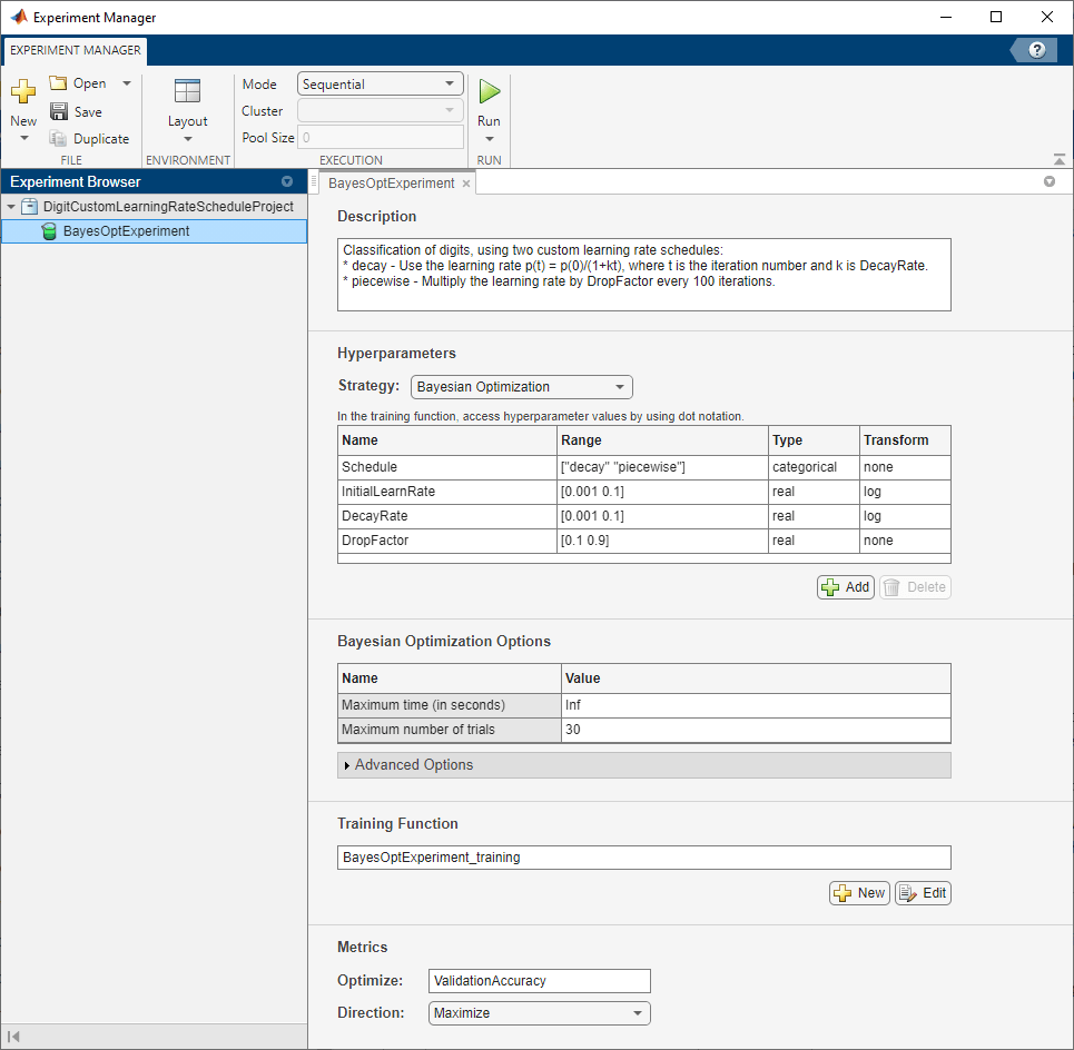 When you run the experiment, Experiment Manager searches for the best combination of hyperparameters. Each trial in the experiment uses a new combination of hyperparameter values based on the results of the previous trials. This example uses the hyperparameters Schedule, InitialLearnRate, DecayRate, and DropFactor to specify the custom learning rate schedule used for training. The options for Schedule are:
