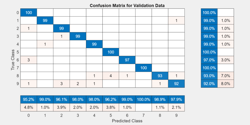 figure(Name="Confusion Matrix") confusionchart(trueLabels,predictedLabels, ... ColumnSummary="column-normalized", ... RowSummary="row-normalized", ... Title="Confusion Matrix for Validation Data");