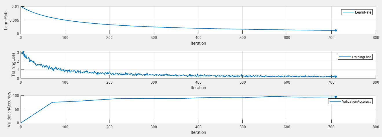 monitor.Metrics = ["LearnRate" "TrainingLoss" "ValidationAccuracy"]; monitor.XLabel = "Iteration"; mbq = minibatchqueue(augimdsTrain,... MiniBatchSize=miniBatchSize,... MiniBatchFcn=@preprocessMiniBatch,... MiniBatchFormat=["SSCB",""],... OutputEnvironment=output.executionEnvironment); iteration = 0; velocity = []; recordMetrics(monitor,iteration,ValidationAccuracy=0); for epoch = 1:numEpochs shuffle(mbq); while hasdata(mbq) iteration = iteration + 1; [X,Y] = next(mbq); [loss,gradients,state] = dlfeval(@modelLoss,net,X,Y); loss = double(gather(extractdata(loss))); net.State = state; switch learnRateSchedule case "decay" learnRate = initialLearnRate/(1 + learnRateDecay*iteration); case "piecewise" if mod(iteration,learnRateDropPeriod) == 0 learnRate = learnRate*learnRateDropFactor; end end recordMetrics(monitor,iteration, ... LearnRate=learnRate, ... TrainingLoss=loss); output.trainingInfo.loss = [output.trainingInfo.loss; iteration loss]; [net,velocity] = sgdmupdate(net,gradients,velocity,learnRate,momentum); if monitor.Stop return; end end numOutputs = 1; mbqTest = minibatchqueue(augimdsValidation,numOutputs, ... MiniBatchSize=miniBatchSize, ... MiniBatchFcn=@preprocessMiniBatchPredictors, ... MiniBatchFormat="SSCB"); predictedLabels = modelPredictions(net,mbqTest,classes); trueLabels = imdsValidation.Labels; accuracy = mean(predictedLabels == trueLabels)*100.0; output.trainedNet = net; monitor.Progress = (epoch*100.0)/numEpochs; recordMetrics(monitor,iteration, ... ValidationAccuracy=accuracy); output.trainingInfo.accuracy = [output.trainingInfo.accuracy; iteration accuracy]; end