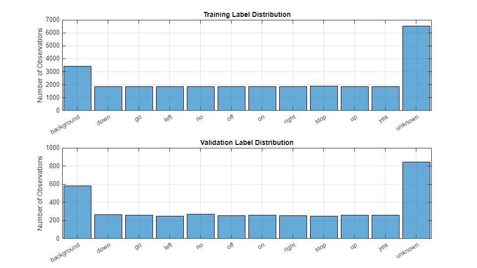 ads = audioDatastore(fullfile(dataset,"validation"), ... IncludeSubfolders=true, ... FileExtensions=".wav", ... LabelSource="foldernames"); isCommand = ismember(ads.Labels,commands); isBackground = ismember(ads.Labels,background); isUnknown = ~(isCommand|isBackground); includeFraction = 0.2; % Fraction of unknowns to include. idx = find(isUnknown); idx = idx(randperm(numel(idx),round((1-includeFraction)*sum(isUnknown)))); isUnknown(idx) = false; ads.Labels(isUnknown) = categorical("unknown"); adsValidation = subset(ads,isCommand|isUnknown|isBackground); adsValidation.Labels = removecats(adsValidation.Labels);