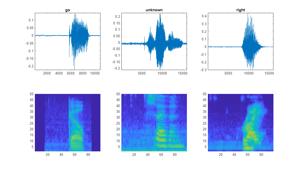 specMin = min(XTrain,[],"all"); specMax = max(XTrain,[],"all"); idx = randperm(numel(adsTrain.Files),3); figure(Units="normalized",Position=[0.2,0.2,0.6,0.6]); tlh = tiledlayout(2,3); for ii = 1:3 [x,fs] = audioread(adsTrain.Files{idx(ii)}); nexttile(tlh,ii) plot(x) axis tight title(string(adsTrain.Labels(idx(ii)))) nexttile(tlh,ii+3) spect = XTrain(:,:,1,idx(ii))'; pcolor(spect) clim([specMin specMax]) shading flat sound(x,fs) pause(2) end