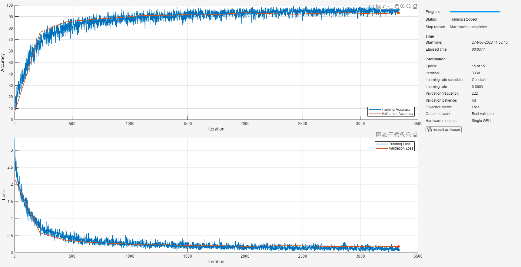 miniBatchSize = 128; validationFrequency = floor(numel(TTrain)/miniBatchSize); options = trainingOptions("adam", ... InitialLearnRate=3e-4, ... MaxEpochs=15, ... MiniBatchSize=miniBatchSize, ... Shuffle="every-epoch", ... Plots="training-progress", ... Verbose=false, ... ValidationData={XValidation,TValidation}, ... ValidationFrequency=validationFrequency, ... Metrics="accuracy");