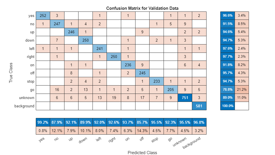figure(Units="normalized",Position=[0.2,0.2,0.5,0.5]); cm = confusionchart(TValidation,YValidation, ... Title="Confusion Matrix for Validation Data", ... ColumnSummary="column-normalized",RowSummary="row-normalized"); sortClasses(cm,[commands,"unknown","background"])