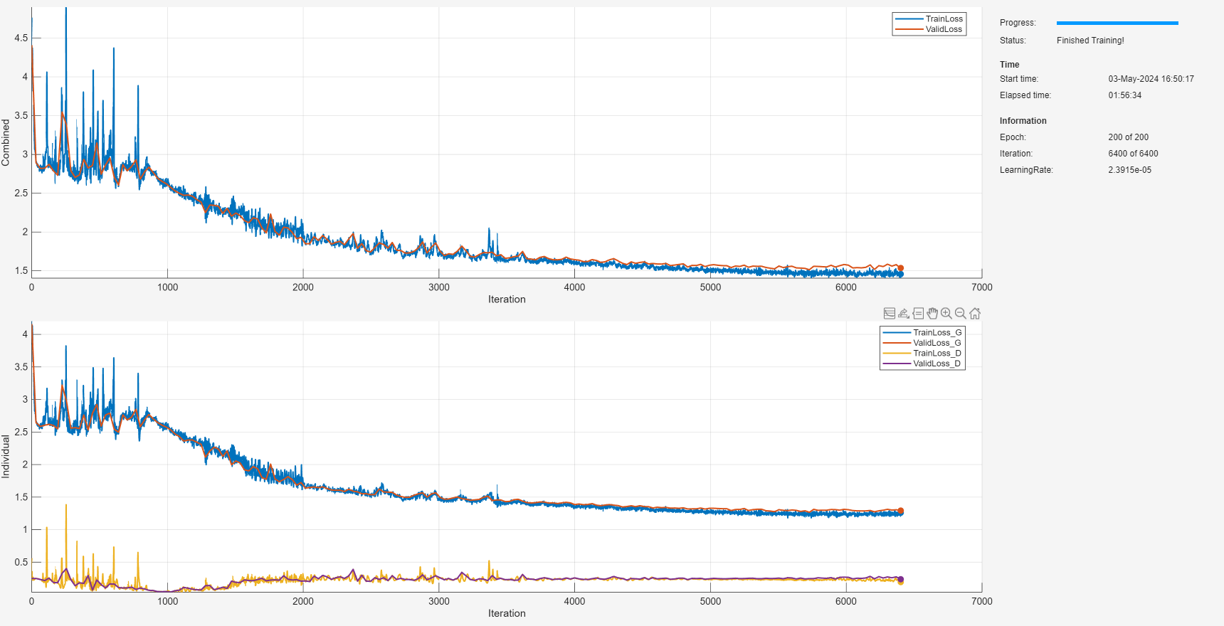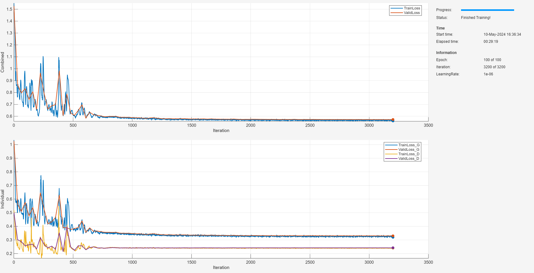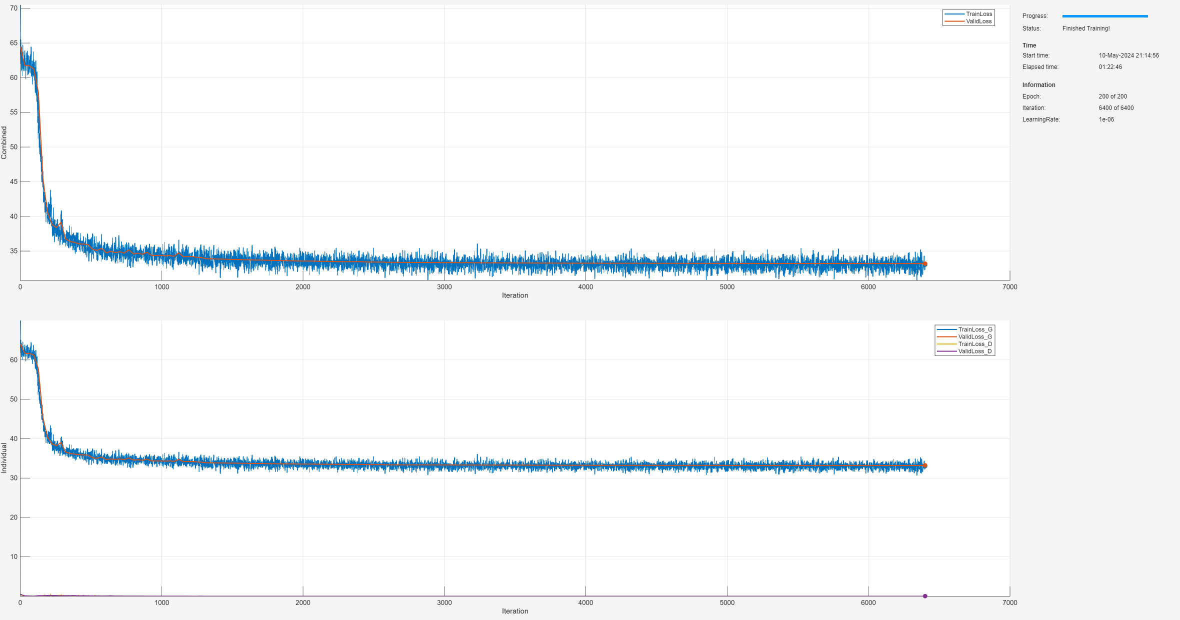 doTrain =false; if doTrain trainOpts = ... struct(MaxEpochs=200, ... MiniBatchSize=1250, ... ValidationFrequency=32, ... InitialLearnRate=5e-5, ... LearnRateDropPeriod=25, ... LearnRateDropFactor=0.9, ... L1LossFactor=0.001); trainGAN(denoiserGANSines, ... [XTrain TTrain],[XValid TValid],trainOpts); else load(fullfile(datasetFolderSines,"denoiserGANSines.mat")) end