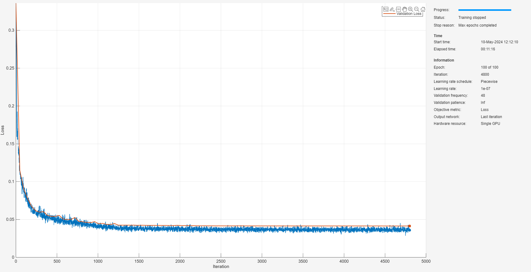 doTrain =false; if doTrain trainOpts = ... struct(MaxEpochs=100, ... MiniBatchSize=1250, ... ValidationFrequency=32, ... LearnRateDropPeriod=25, ... LearnRateDropFactor=0.5); trainAE(denoiserAESines, ... [XTrain TTrain],[XValid TValid],trainOpts); else datasetZipFile = matlab.internal.examples.downloadSupportFile("SPT","data/trainedDenoiserObjectSines.zip"); datasetFolderSines = fullfile(fileparts(datasetZipFile),"trainedDenoiserObjectSines"); unzip(datasetZipFile,fileparts(datasetZipFile)); delete(datasetZipFile); load(fullfile(datasetFolderSines,"denoiserAESines.mat")) end