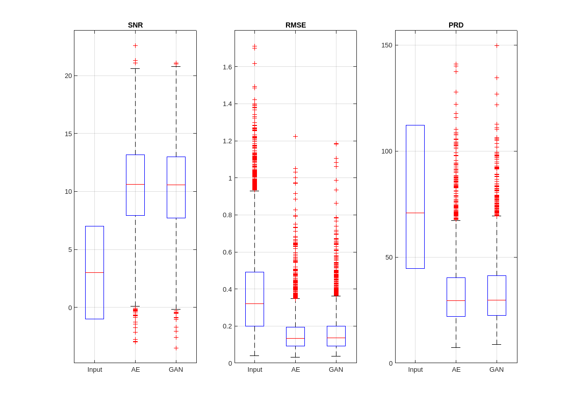 [RMSE_in,PRD_in,SNR_in] = helperComputeMetrics(XTest,TTest); [RMSE_AE,PRD_AE,SNR_AE] = helperComputeMetrics(YAE,TTest); [RMSE_GAN,PRD_GAN,SNR_GAN] = helperComputeMetrics(YGAN,TTest);