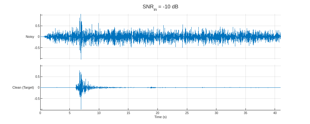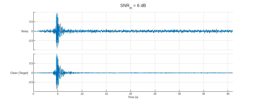 function helperPlotTrainData(X,T,fsample,plotFreqSpectrum) % This function is only intended to support this example. % It may be changed or removed in a future release. % Setup for potential subplotting if nargin < 4 plotFreqSpectrum = 0; tileFactor = 0; elseif plotFreqSpectrum > 0 tileFactor = 1; end % Identify highest and lowest SNR inputs SNRs = cellfun(@(x,t) snr(t,x-t), X, T); [val(1),ind(1)] = min(SNRs); [val(2),ind(2)] = max(SNRs); % Plot examples via loop for ii = 1:2 % Initialize plot figure(Position=[0 0 1000 400]) tl = tiledlayout(1,tileFactor+1,TileSpacing="compact"); tl.Title.String = "SNR_{in} = "+val(ii)+" dB"; % Time domain plots % Prepare to transpose if necessary [nRow,nCol] = size(X{1}); % Compute time domain and get signals L = length(X{ind(ii)}); time = linspace(0,L/fsample,L); if nRow > nCol X_time = X{ind(ii)}; T_time = T{ind(ii)}; else X_time = X{ind(ii)}'; T_time = T{ind(ii)}'; end % Plot predictor and target (time domain) nexttile(tl,1) ax = stackedplot(time,[X_time T_time]); ax.DisplayLabels = ["Noisy" "Clean (Target)"]; lims = [min(ax.AxesProperties(1).YLimits(1), ... ax.AxesProperties(2).YLimits(1)) ... max(ax.AxesProperties(1).YLimits(2), ... ax.AxesProperties(2).YLimits(2))]; lims = max(abs(lims)).*[-1 1]; [ax.AxesProperties(1).YLimits, ... ax.AxesProperties(2).YLimits] = deal(lims); ax.XLabel = "Time (s)"; grid on % Frequency domain plots, if requested if plotFreqSpectrum % First, zoom the time domain plots ax.XLimits = [0 round(time(floor(end/5)),1)]; % Single-sided FFT for predictor and target freq = fsample*(0:floor(L/2))/L; X_freq = fft(X_time); X_freq = abs(X_freq(1:floor(L/2)+1))/L; X_freq(2:end-1) = 2*X_freq(2:end-1); T_freq = fft(T_time); T_freq = abs(T_freq(1:floor(L/2)+1))/L; T_freq(2:end-1) = 2*T_freq(2:end-1); % Plot predictor and target (freq domain) nexttile(tl,2) ax = stackedplot(freq,[X_freq T_freq]); ax.DisplayLabels = ["" ""]; lims = [min(ax.AxesProperties(1).YLimits(1), ... ax.AxesProperties(2).YLimits(1)) ... max(ax.AxesProperties(1).YLimits(2), ... ax.AxesProperties(2).YLimits(2))]; lims = [0 max(abs(lims))]; [ax.AxesProperties(1).YLimits, ... ax.AxesProperties(2).YLimits] = deal(lims); ax.XLimits = [0 round(freq(end))]; ax.XLabel = "Frequency (Hz)"; grid on end end end