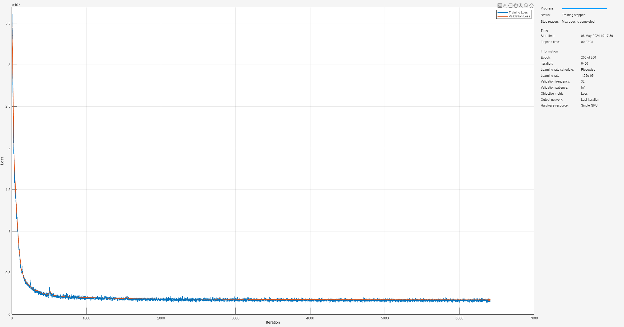 doTrain =false; if doTrain denoiserAESeismic = ... helperDeepSignalDenoiserAE(SignalLength=4096, ... NumDownSamples=4, ... FilterSize=64, ... NumDownSampleLayerFilters=32, ... NumExternalLayerFilters=64, ... Leakiness=0.1) trainOpts = struct(MaxEpochs=200, ... MiniBatchSize=500, ... ValidationFrequency=32, ... LearnRateDropPeriod=50, ... LearnRateDropFactor=0.5); trainAE(denoiserAESeismic, ... [XTrain TTrain],[XValid TValid],trainOpts); else datasetZipFile = matlab.internal.examples.downloadSupportFile("SPT","data/trainedDenoiserObjectSeismic.zip"); datasetFolderECG = fullfile(fileparts(datasetZipFile),"trainedDenoiserObjectSeismic"); unzip(datasetZipFile,fileparts(datasetZipFile)); delete(datasetZipFile); load(fullfile(datasetFolderECG,"denoiserAESeismic.mat")) end