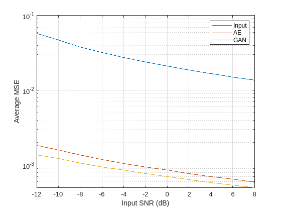 figure semilogy(SNRs,[MSE_in MSE_AE MSE_GAN]) legend(["Input" "AE" "GAN"],Location="Northeast") ylabel("Average MSE") xlabel("Input SNR (dB)") grid on