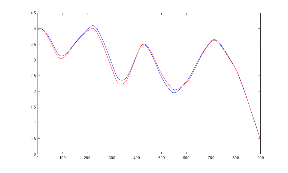 The figure illustrates the iterated prediction. The blue line is the actual position of the magnet, and the red line is the position predicted by the NARX neural network. Even though the network is predicting 900 time steps ahead, the prediction is very accurate.