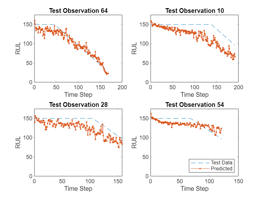 function rulExamplePlots(observationIdx,YTest,YPred) N = numel(observationIdx); figure for i = 1:N subplot(N/2,2,i) plot(YTest{observationIdx(i)},'--') hold on plot(YPred{observationIdx(i)},'.-') hold off ylim([0 175]) title("Test Observation " + observationIdx(i)) xlabel("Time Step") ylabel("RUL") end legend(["Test Data" "Predicted"],Location="southeast") end