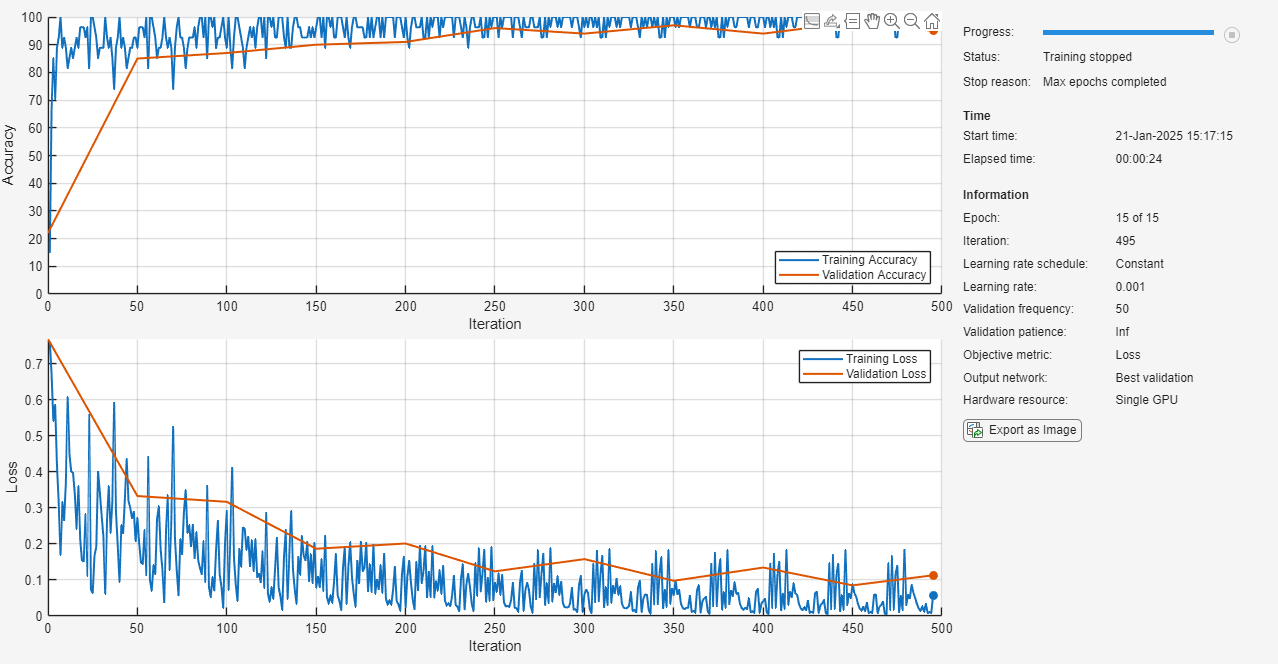 miniBatchSize = 27; options = trainingOptions("adam", ... MiniBatchSize=miniBatchSize, ... MaxEpochs=15, ... SequencePaddingDirection="left", ... ValidationData={XValidation,TValidation}, ... Metrics="accuracy", ... Plots="training-progress", ... Verbose=false);