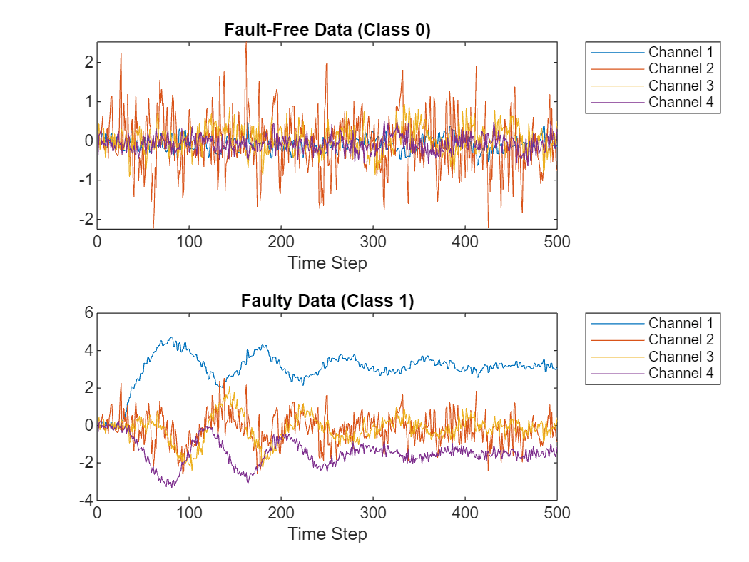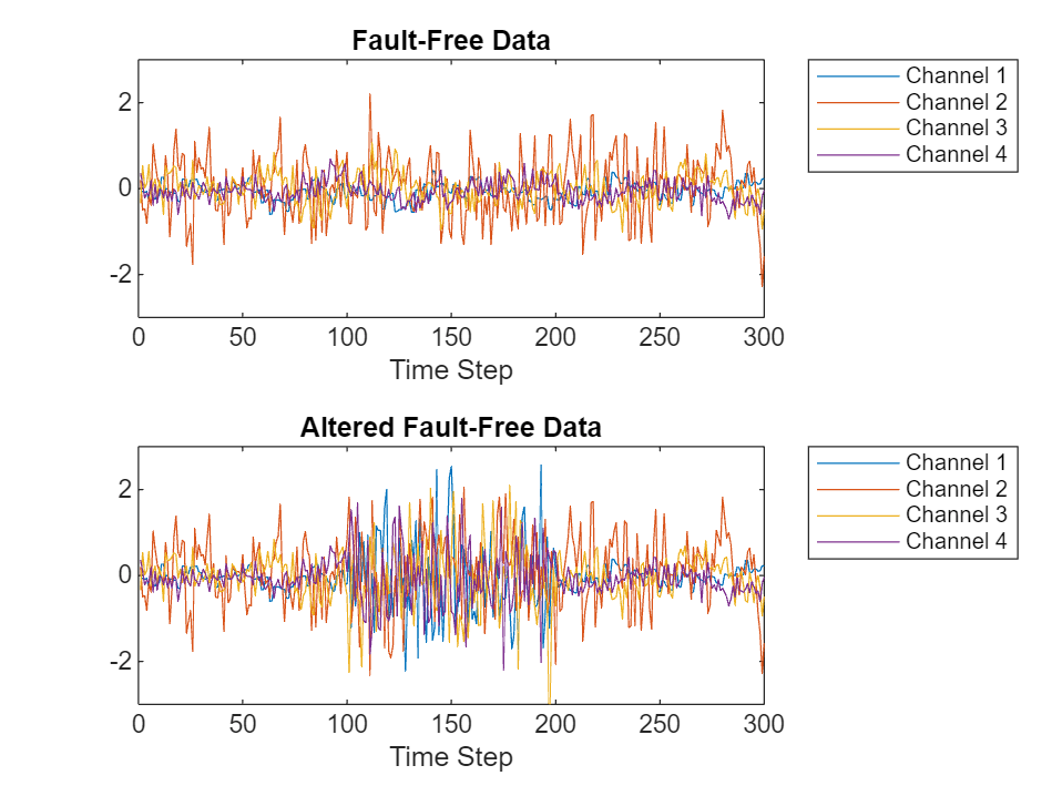 figure tiledlayout(2,1) nexttile plot(faultfreetestingSample(1:4, 1:300)') ylim([-3 3]) xlabel("Time Step"); title("Fault-Free Data") legend("Channel " + string(1:4),Location="northeastoutside") nexttile plot(alteredFaultFreeSignal(1:4, 1:300)') ylim([-3 3]) xlabel("Time Step") title("Altered Fault-Free Data") legend("Channel " + string(1:4),Location="northeastoutside")