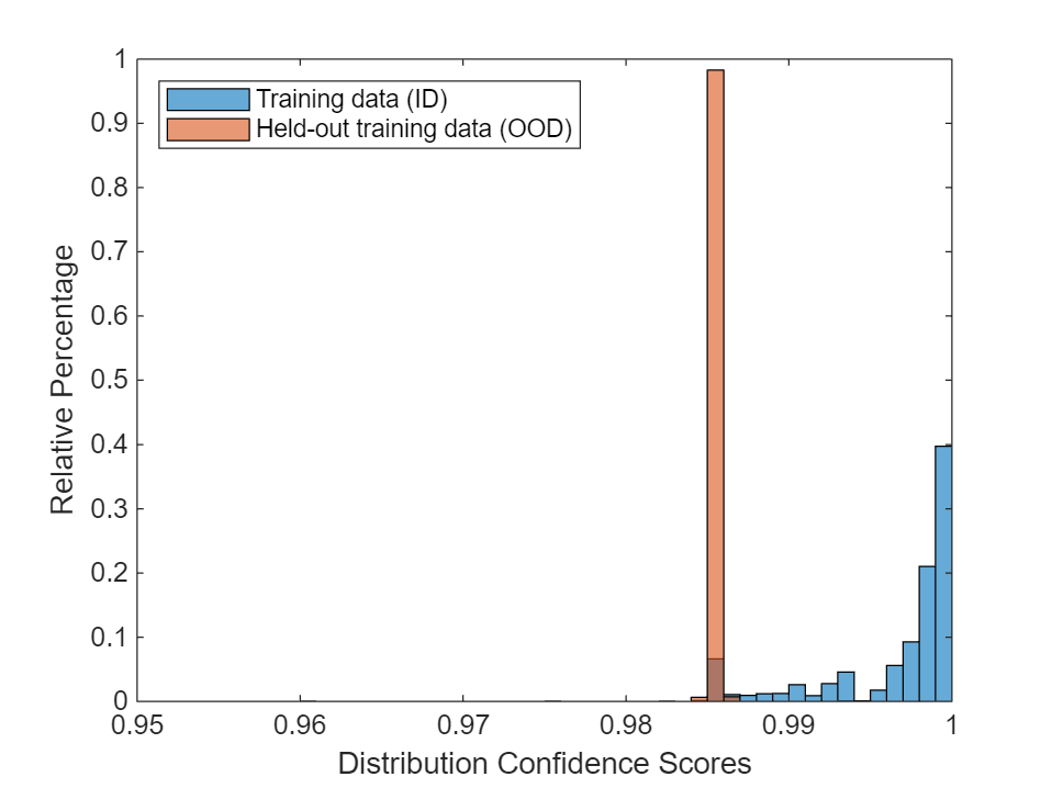 figure binWidth = 0.001; histogram(scoreTraining,Normalization="probability",BinWidth=binWidth) hold on histogram(scoreTrainingHoldOut,Normalization="probability",BinWidth=binWidth) hold off xlim([0.95 1]); legend("Training data (ID)", "Held-out training data (OOD)",Location="northwest") xlabel("Distribution Confidence Scores") ylabel("Relative Percentage")