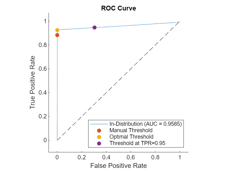 discriminatorTPR = networkDistributionDiscriminator(net,XTrain,XTrainHoldOut,method,TruePositiveGoal=0.95); tfIDTPR = isInNetworkDistribution(discriminatorTPR,XTest); tfOODTPR = isInNetworkDistribution(discriminatorTPR,XTestHoldOut); [TPROptimizedTPR,FPROptimizedTPR] = helperPredictionMetrics(tfIDTPR,tfOODTPR)
