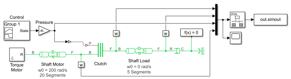 Generate the training data using the Simulink model ex_sdl_flexible_shaft, attached to this example as a supporting file. To access this model, open this example as a live script. This Simulink model simulates a flexible shaft. It has two flexible aluminum shafts modeled using a lumped parameter approach: the motor shaft, consisting of 20 segments, and the load shaft, consisting of 5 segments. Both shafts contain inertias, damping, and stiff torsional springs. At the start of the simulation, the clutch is unlocked and the driven shaft is free. The initial velocity of the motor shaft is set to 200 rad/s and the system starts at steady state. The model uses the pressure applied on the clutch as a control parameter to determine the dynamics of the model.