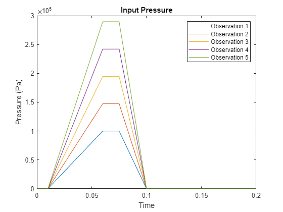 figure for i = 1:5 pressure = data{i}(3,:); plot(times,pressure); hold on end title("Input Pressure") legend("Observation " + (1:5)) xlabel("Time") ylabel("Pressure (Pa)") hold off
