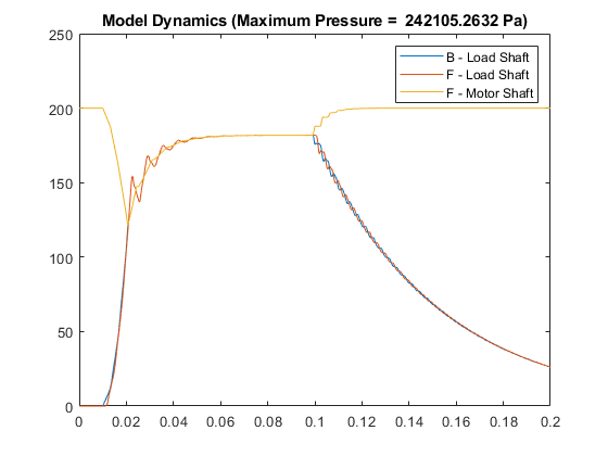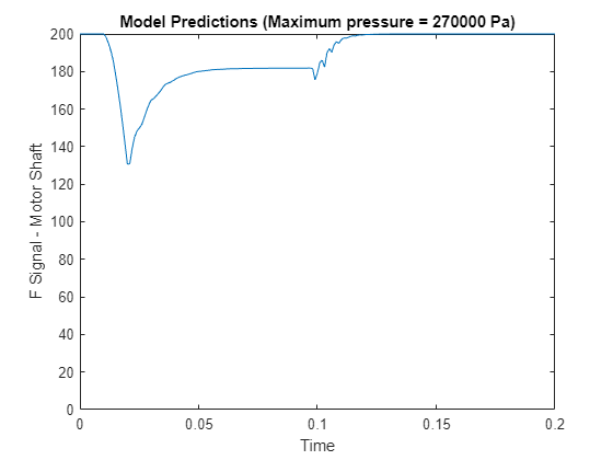 figure plot(simout.simout.Time, Y) ylim([0 inf]) xlabel("Time") ylabel("F Signal - Motor Shaft") title("Model Predictions (Maximum pressure = " + maxPressure + " Pa)")