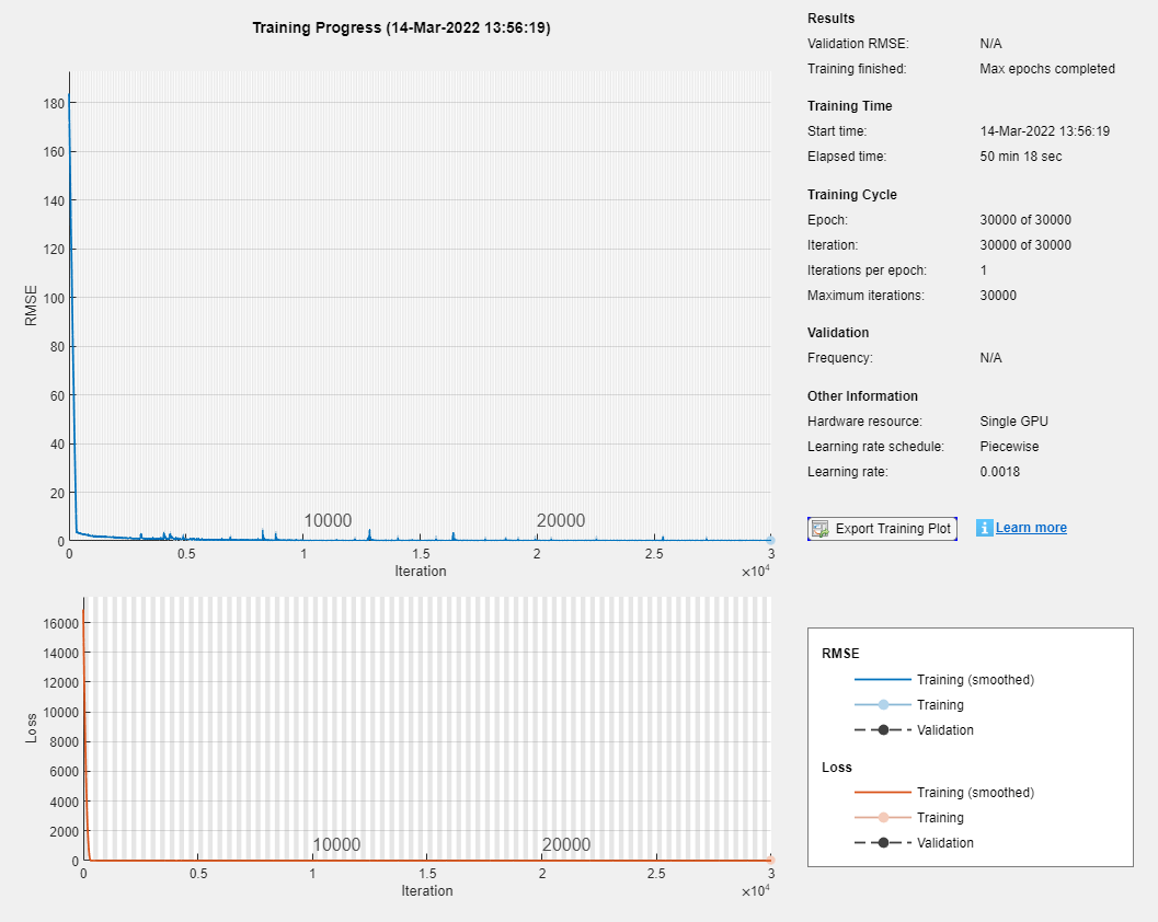 options = trainingOptions("adam", ... MaxEpochs=3e4, ... GradientThreshold=1, ... InitialLearnRate=5e-3, ... LearnRateSchedule="piecewise", ... LearnRateDropPeriod=1e4, ... LearnRateDropFactor=0.6, ... Verbose=0, ... Plots="training-progress");