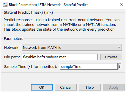 In the Stateful Predict block, set the File path parameter to the location of the saved trained network and specify the same sample time used for generating the training data. Use the same sample time in the Rate Transition block connected to the Stateful Predict block input and the Unit Delay block.
