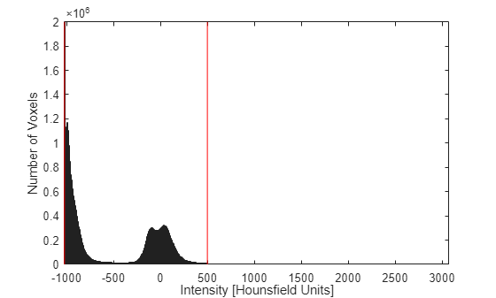 figure histogram(V) xlim([min(V,[],"all") max(V,[],"all")]) ylim([0 2e6]) xlabel("Intensity [Hounsfield Units]") ylabel("Number of Voxels") xline([-1024 500],"red",LineWidth=1)