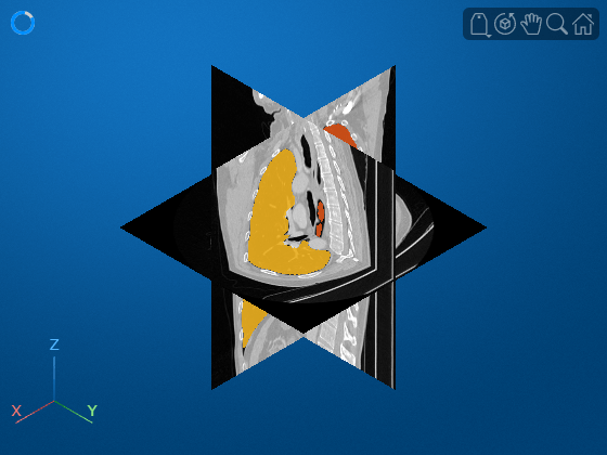 You can also display the preprocessed test volume as slice planes with the predicted segmentation labels as an overlay by setting the RenderingStyle name-value argument to "SlicePlanes". Specify the lung segmentation label using the OverlayData name-value argument.