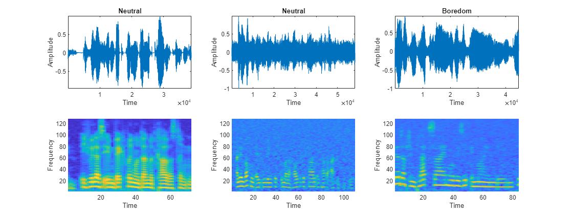numPlots = 3; idx = randperm(numel(augadsTrain.Files),numPlots); f = figure; f.Position(3) = 2*f.Position(3); tiledlayout(2,numPlots,TileIndexing="columnmajor") for ii = 1:numPlots [X,fs] = audioread(augadsTrain.Files{idx(ii)}); nexttile plot(X) axis tight title(augadsTrain.Labels(idx(ii))) xlabel("Time") ylabel("Amplitude") nexttile spect = permute(featuresTrain{idx(ii)}(:,1,:), [1 3 2]); pcolor(spect) shading flat xlabel("Time") ylabel("Frequency") end