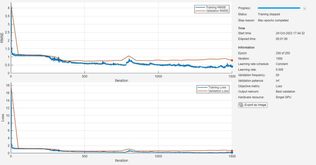 options = trainingOptions("adam", ... MaxEpochs=250, ... ValidationData={XValidation TValidation}, ... InitialLearnRate=0.005, ... SequenceLength="shortest", ... Metrics="rmse", ... Plots="training-progress", ... Verbose=false);